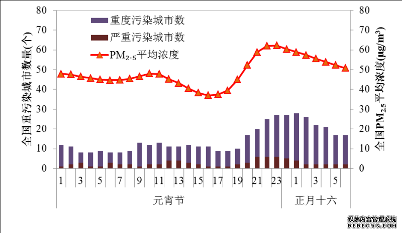 图1 2020年元宵节期间全国逐小时重污染城市数量及PM2.5平均浓度