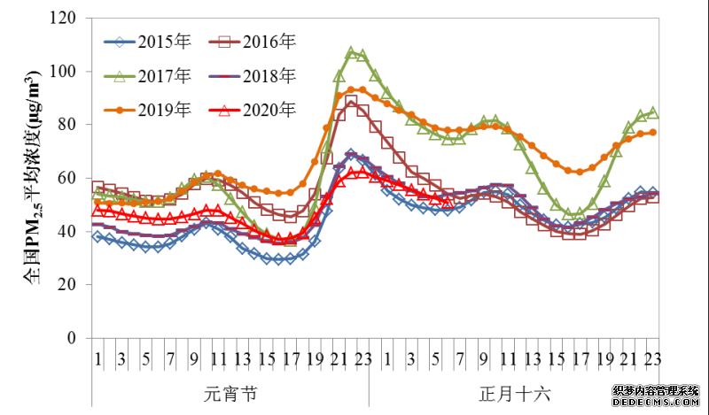 图2 近六年元宵节期间全国逐小时PM2.5平均浓度