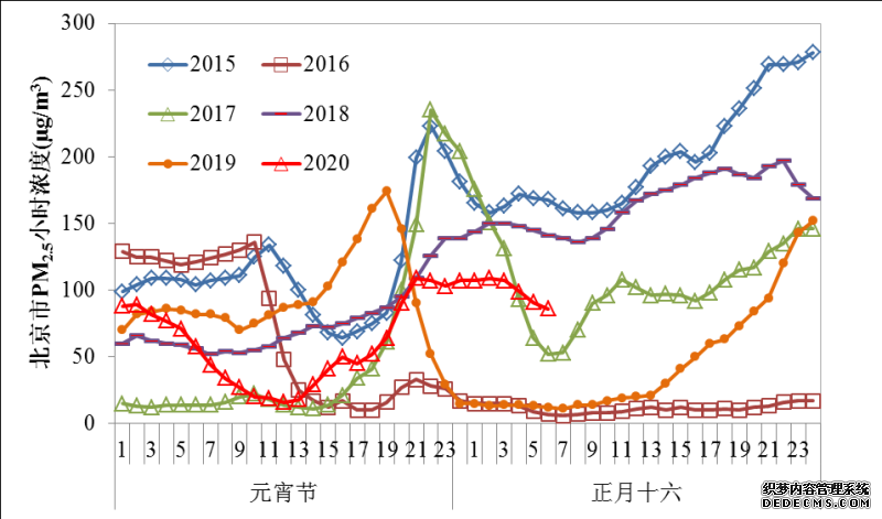 图4 2015年至2020年元宵节期间北京市逐小时PM2.5浓度