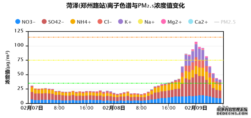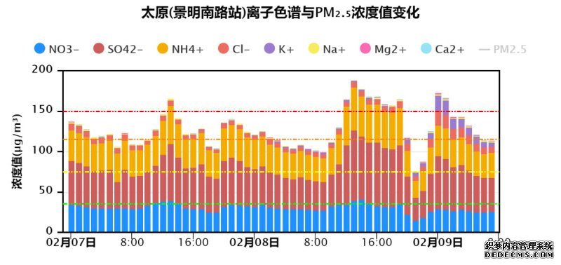 据京津冀及周边地区组分网观测结果,受烟花爆竹集中燃放影响,元宵节夜间京津冀及周边地区多个城市PM2.5组分中指示烟花爆竹燃放的特征组分浓度上升显著,包括硫酸盐、钾离子、氯离子、镁离子、无机碳等,京津冀及周边城市中,菏泽、德州、太原、沧州、濮阳、聊城等城市相关特征组分浓度上升最大。