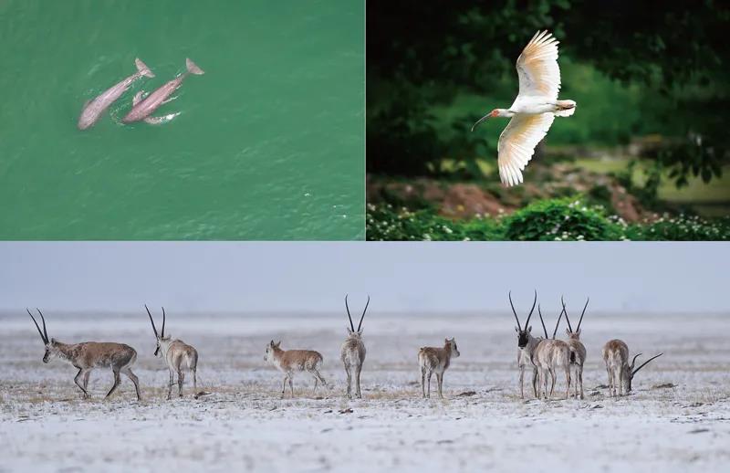 我国系统实施濒危物种拯救工程,多种濒危野生动植物得到有效保护和恢复。这是一张拼版照片:左上图为2021年5月11日,在湖北省宜昌市江边,长江江豚在水中嬉戏(无人机照片,新华社记者 肖艺九/摄);右上图为2021年5月13日拍摄的陕西省汉中市洋县朱鹮生态园内的朱鹮(新华社记者 刘潇/摄);下图为2021年4月20日,藏羚羊在三江源可可西里地区活动(新华社记者 吴刚/摄)。